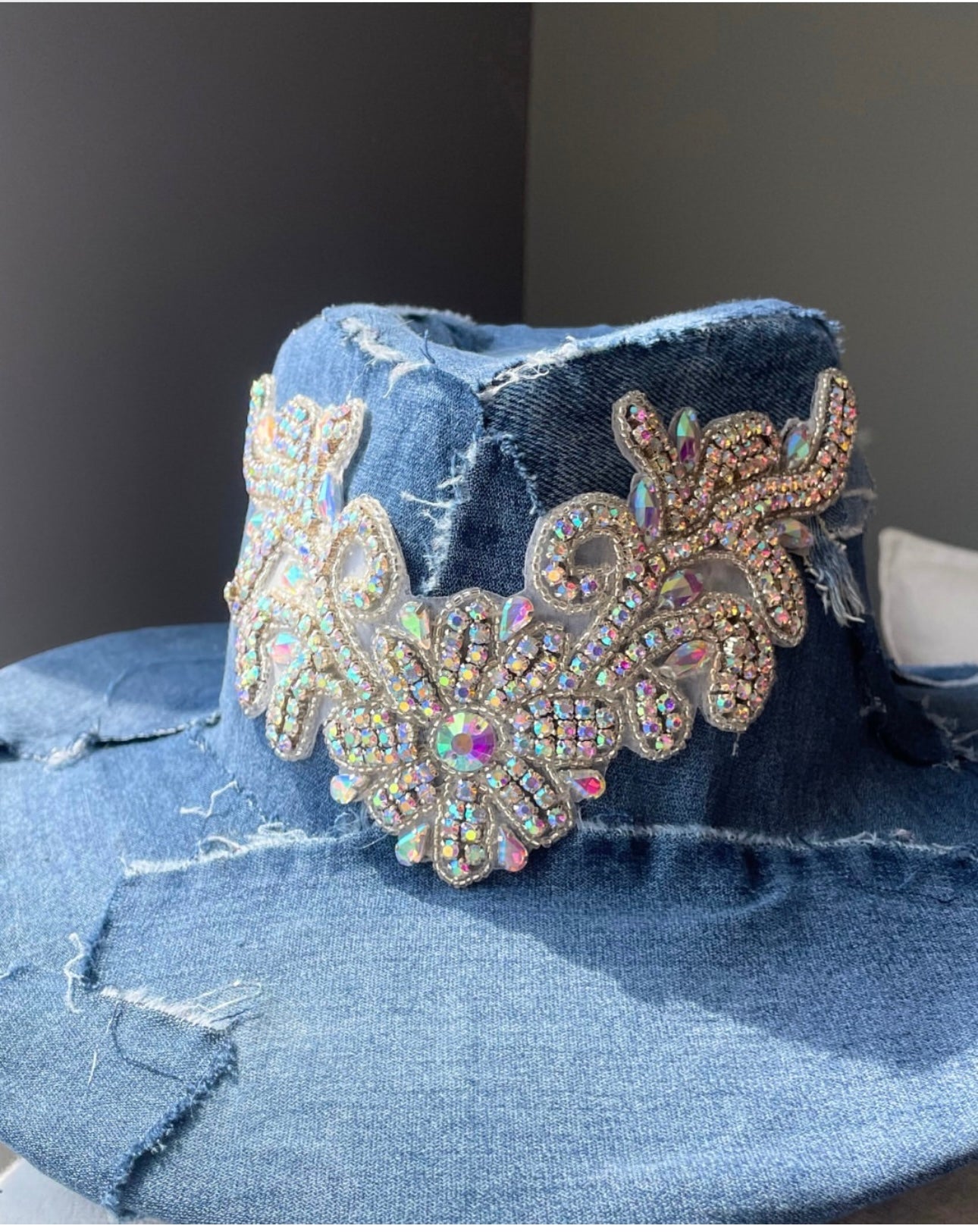 Pieza única, forrado en mezclilla, alta calidad, toquilla y colgantes de pedrería, incluye cubre polvo para su cuidado